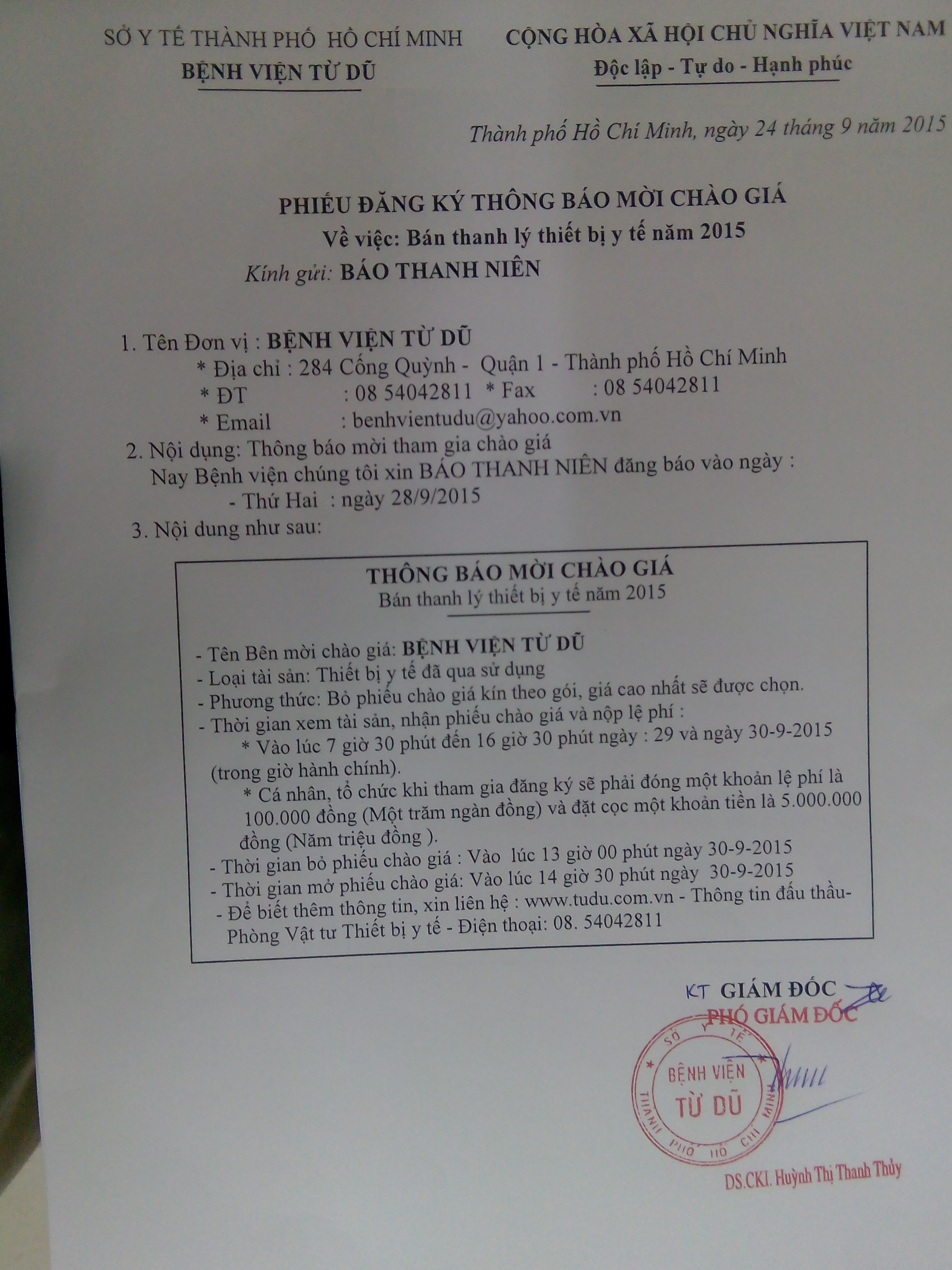 Thông báo mời chào giá Bán thanh lý thiết bị y tế năm 2015