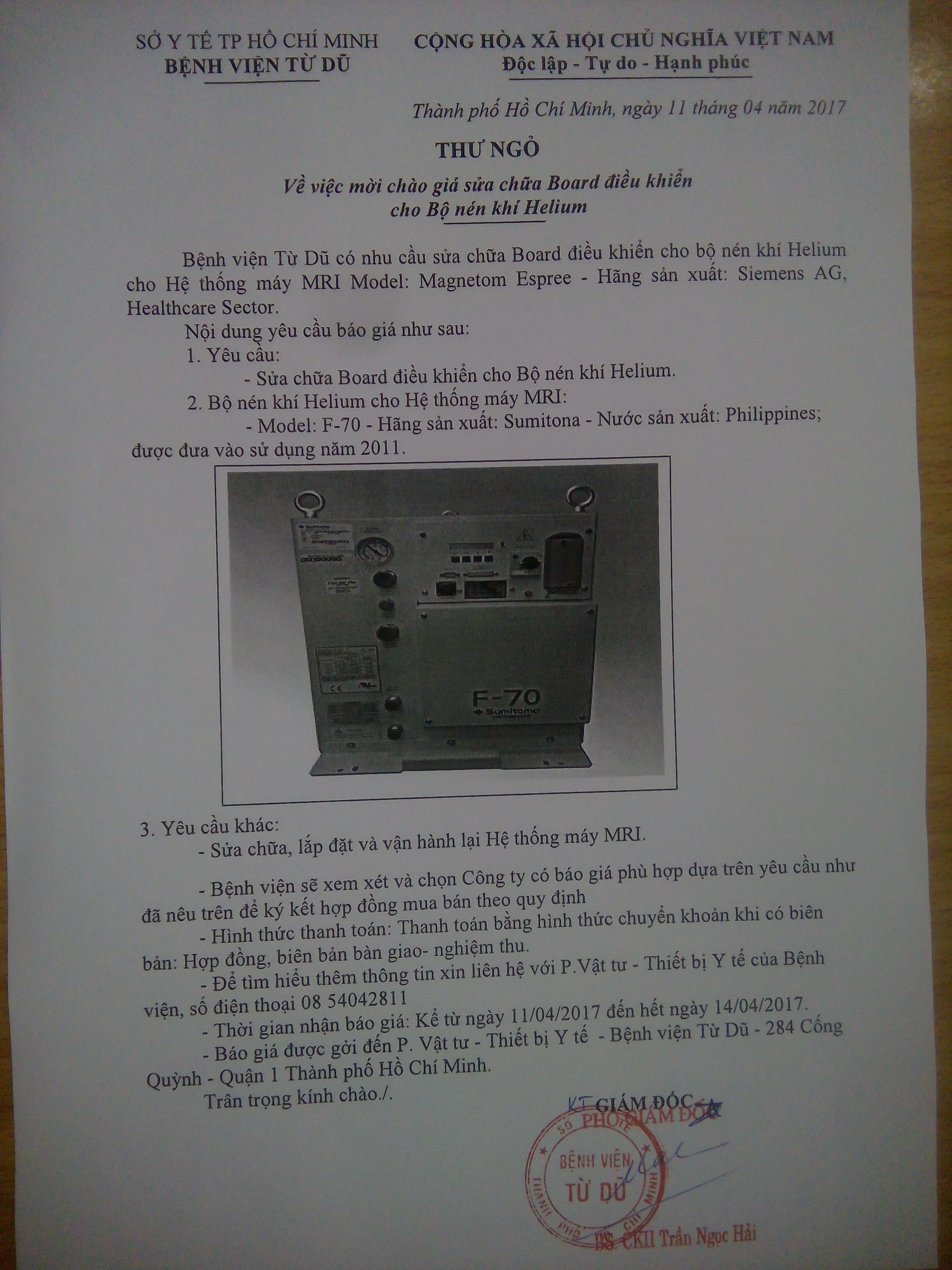 Bệnh viện Từ Dũ có nhu cầu sửa chữa Board điều khiển cho bộ nén khí Helium cho Hệ thống máy MRI Model: Magnetom Espree - Hãng sản xuất: Siemens AG, Healthcare Sector.